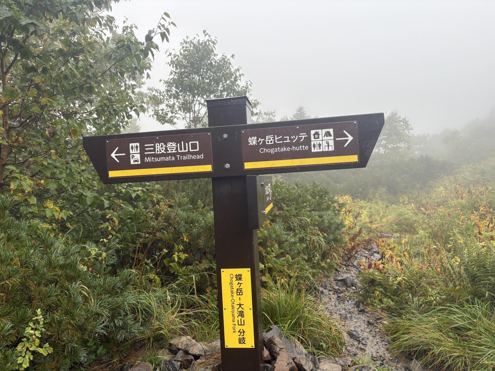 小屋の奥には蝶ヶ岳山頂の標識がうっすら見えています。