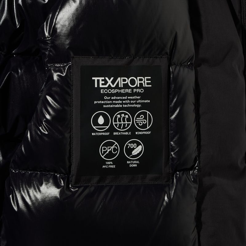 リサイクル素材だけで構成したオリジナルの完全防水・防風・透湿システム、テキサポール・エコスフィア・プロ採用で、どんな悪天候にも耐える防水ダウンジャケットです。