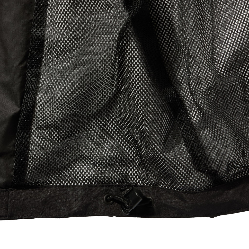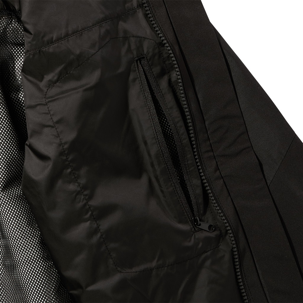 独自開発の防水透湿機能テキサポール・コアを備えるシェルに、前身頃だけを中綿パネルで切り替えた着脱ライニングを装着。