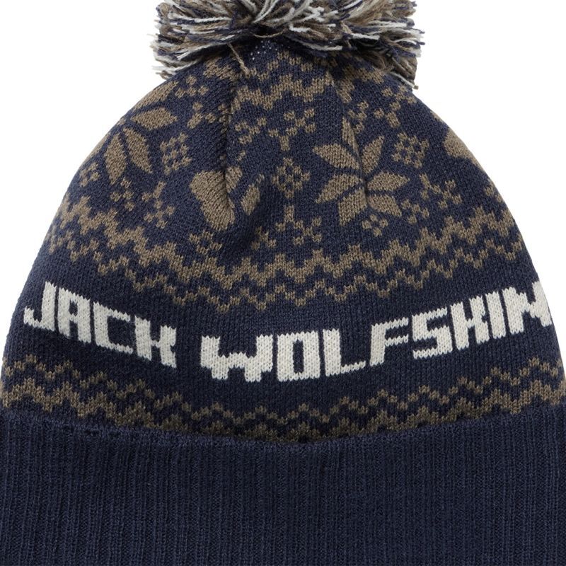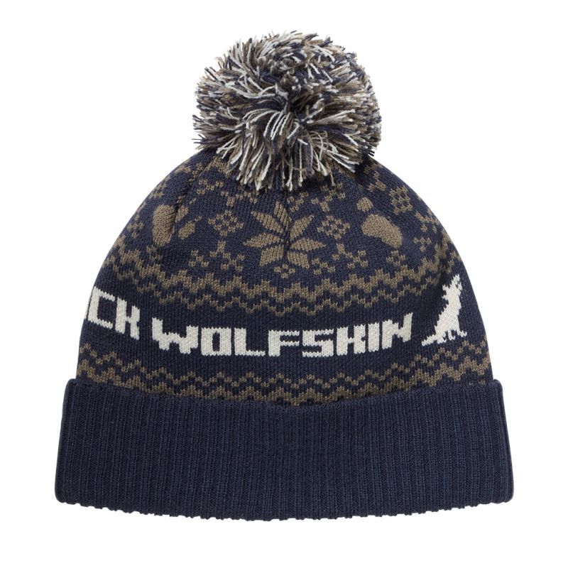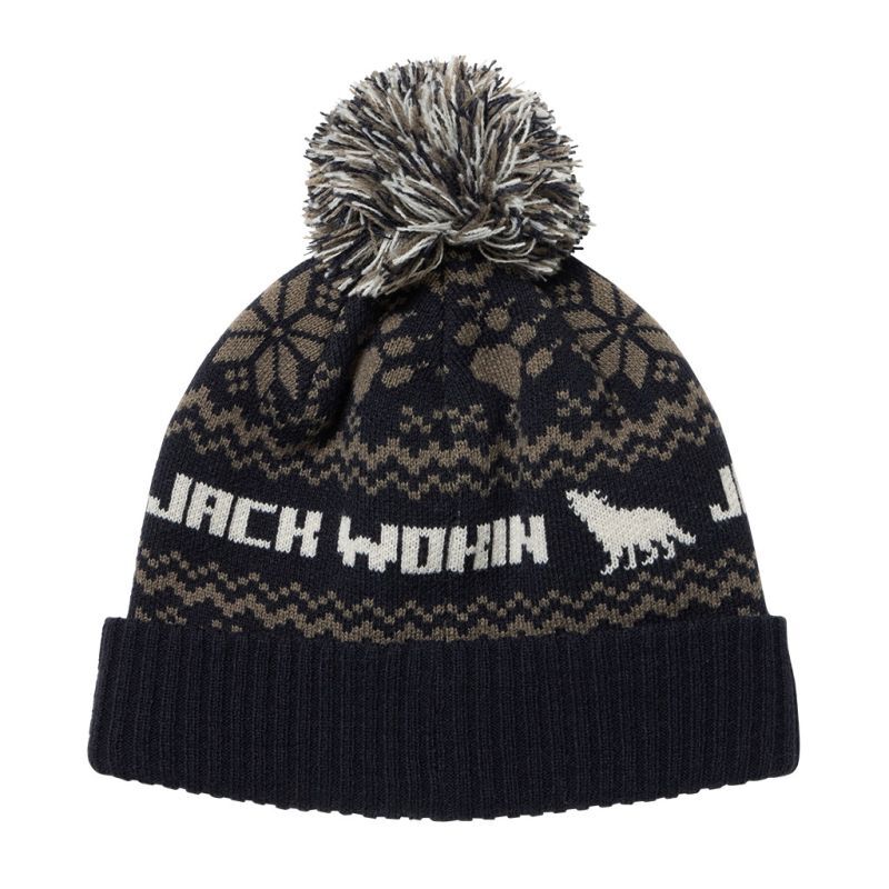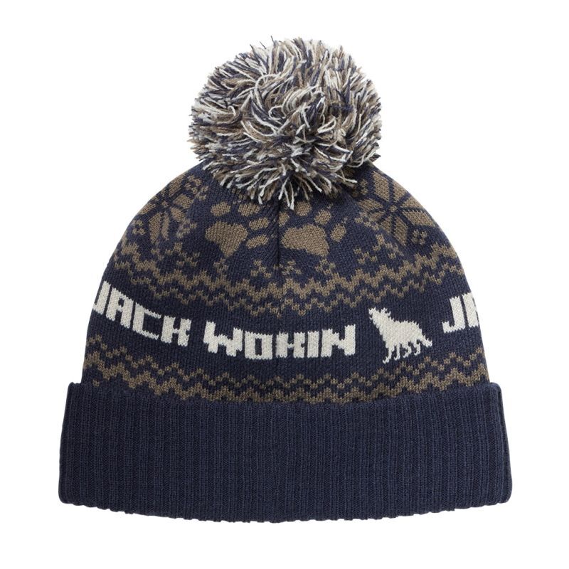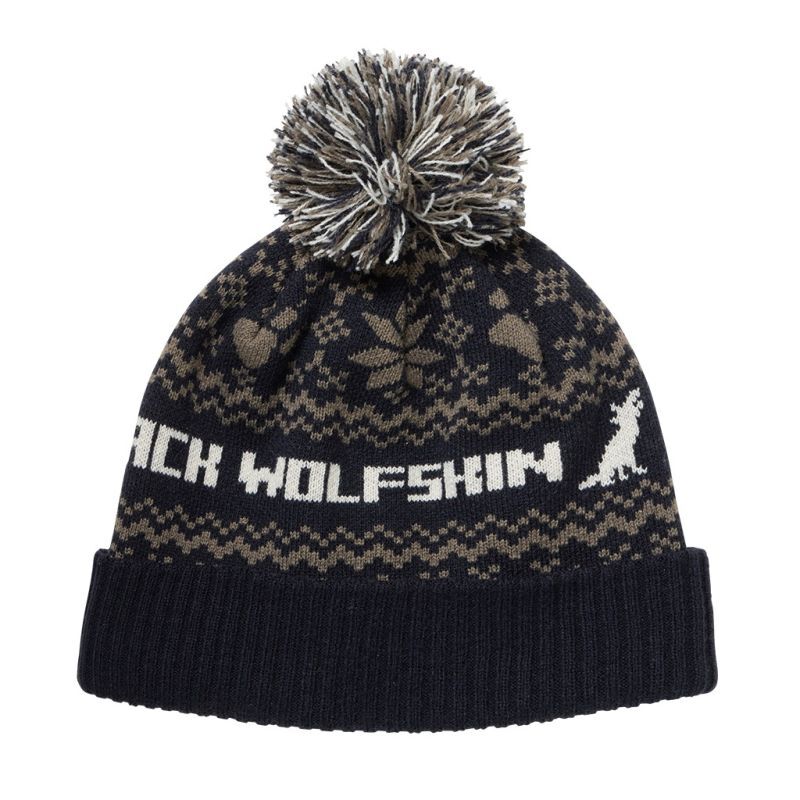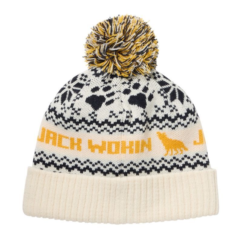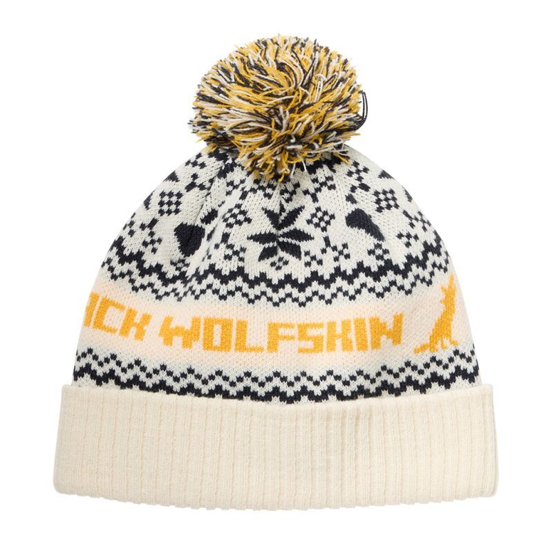 ウルフ、ポーマーク、ブランドネームと、ジャック・ウルフスキンのアイコニックなモチーフを散りばめたオリジナルスノーフレーク柄をジャカードした、秋冬らしいポンポン付きニットビーニーです。