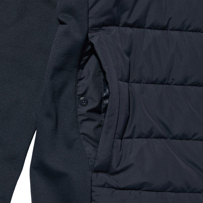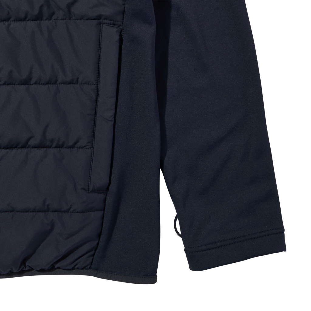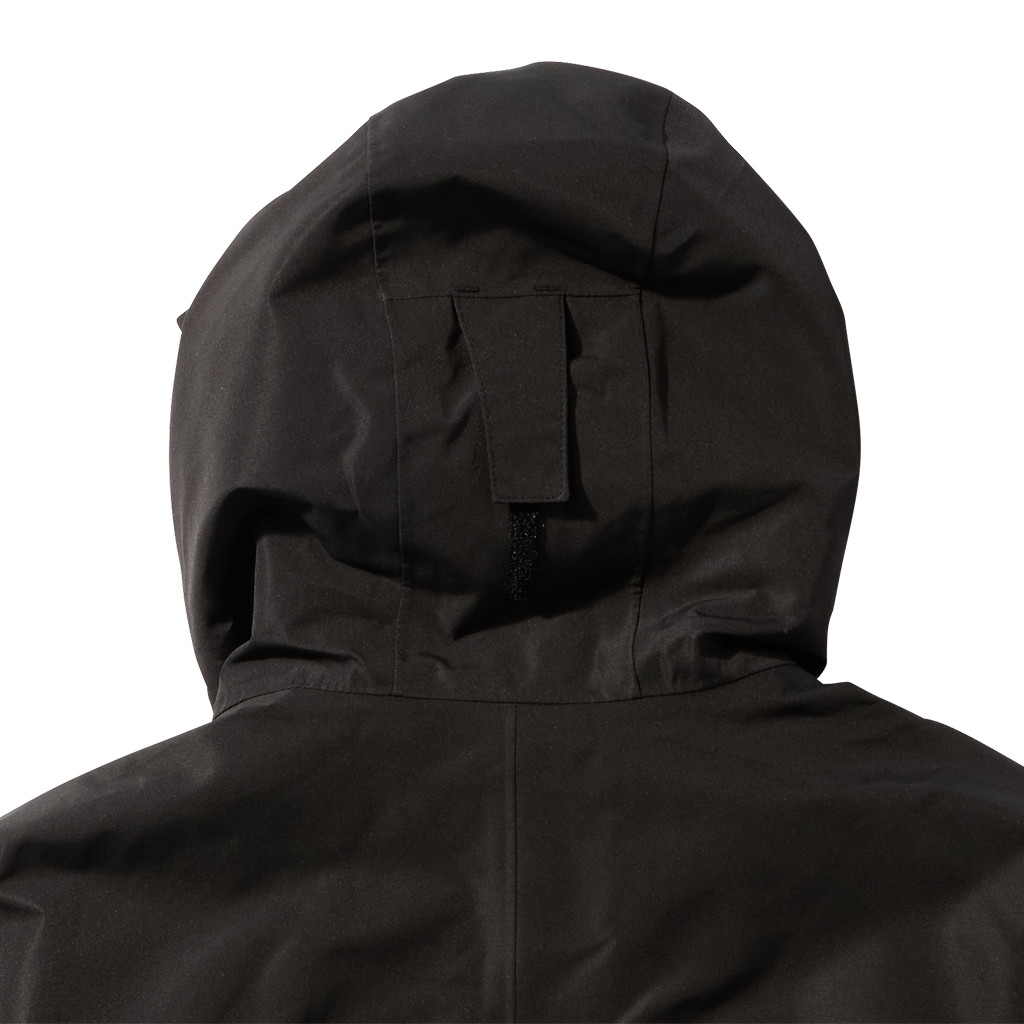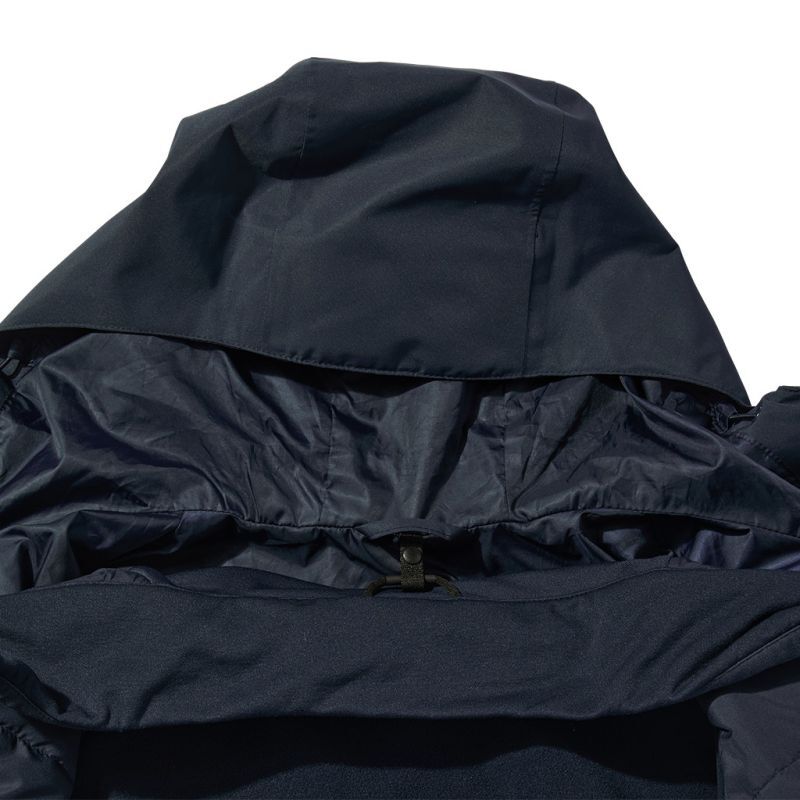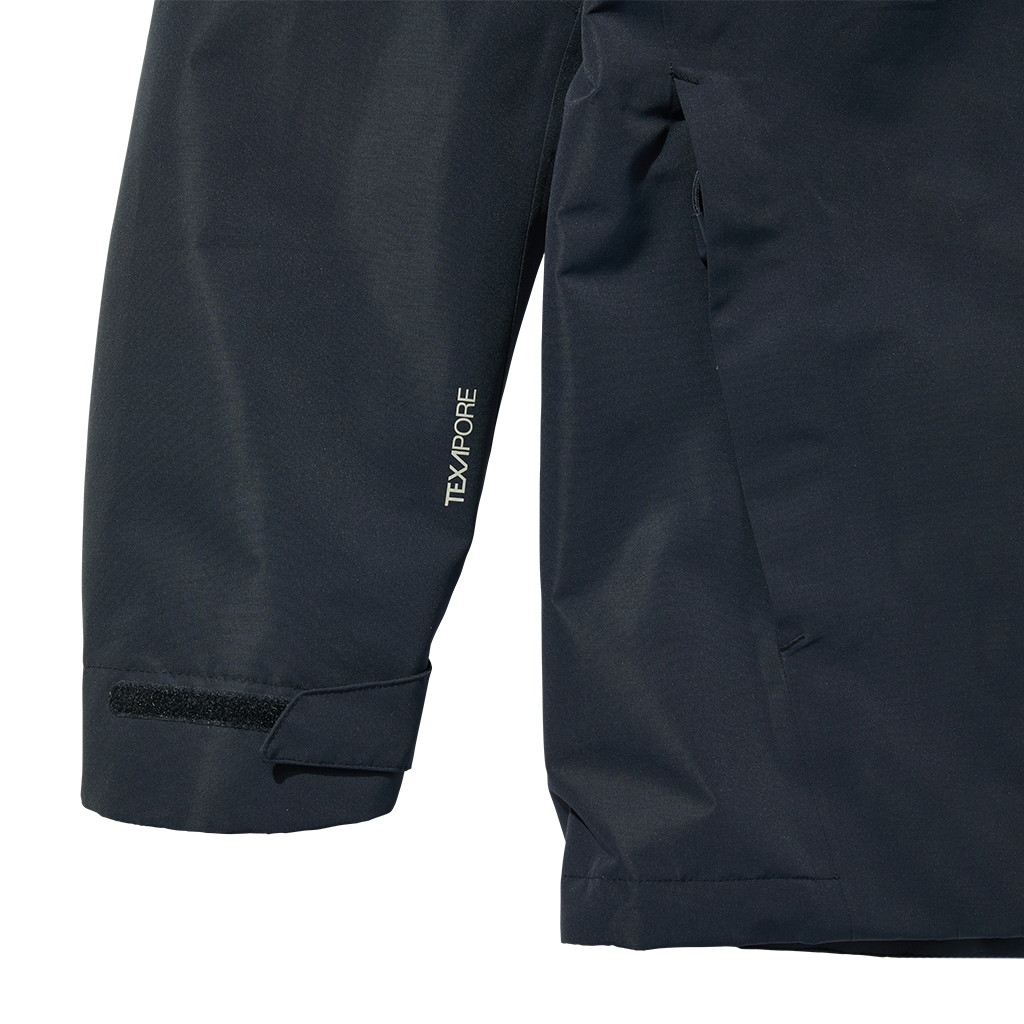 独自開発の防水透湿機能テキサポール・コアを備えるシェルに、前身頃だけを中綿パネルで切り替えた着脱ライニングを装着。