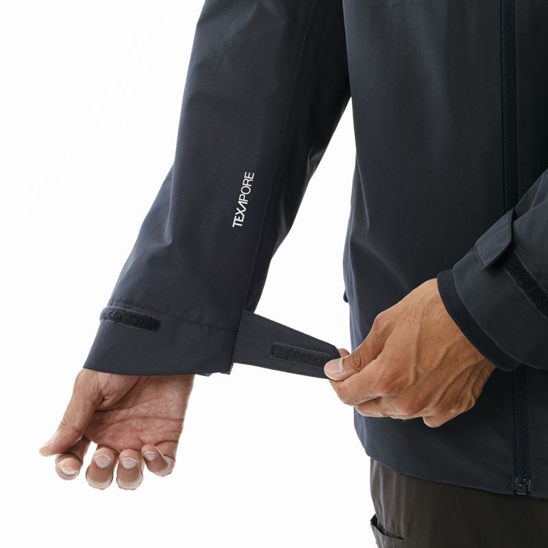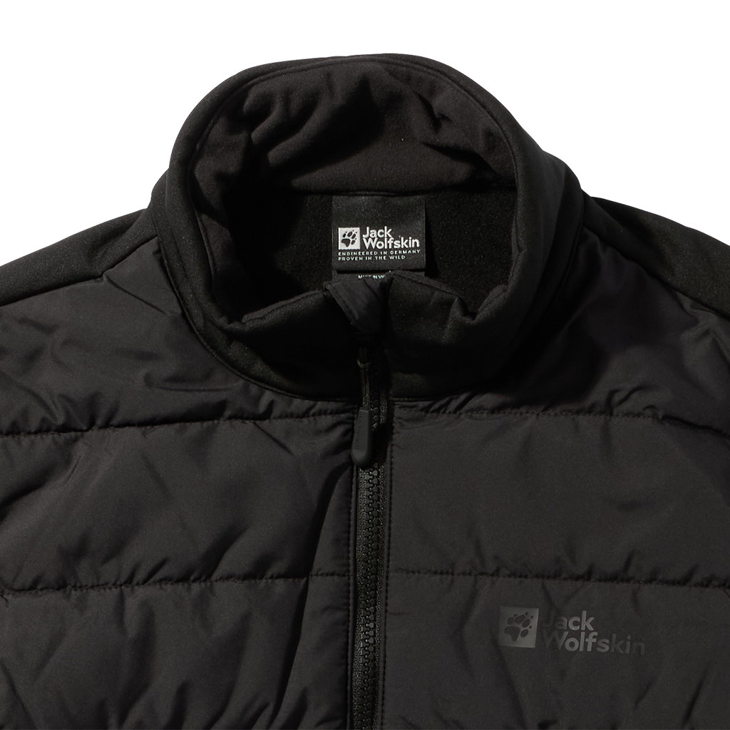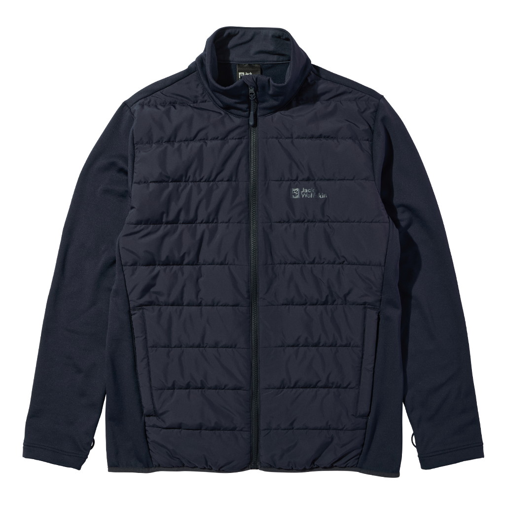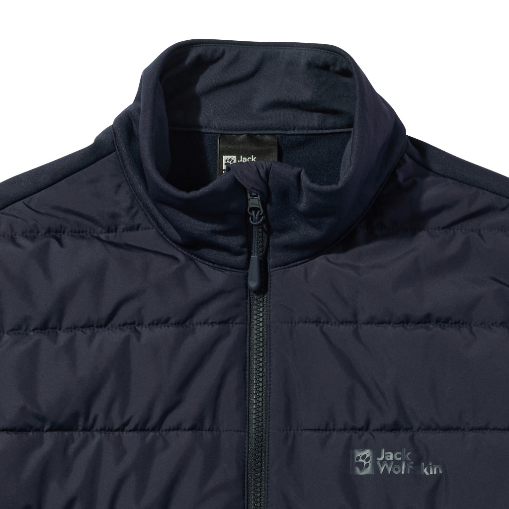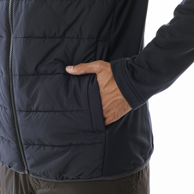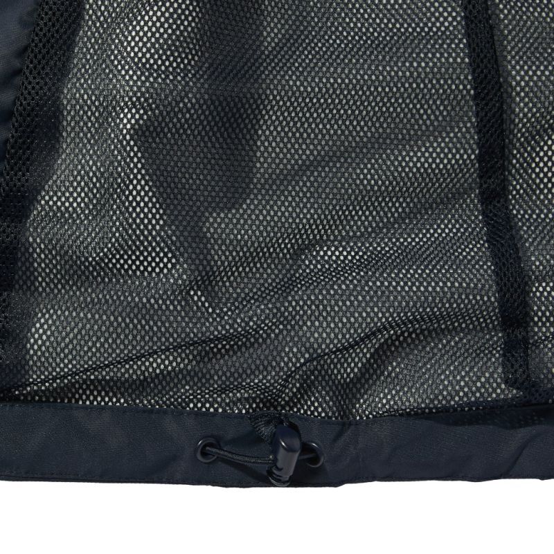 独自開発の防水透湿機能テキサポール・コアを備えるシェルに、前身頃だけを中綿パネルで切り替えた着脱ライニングを装着。