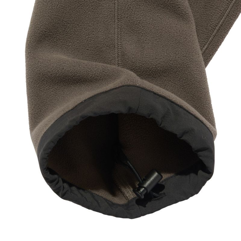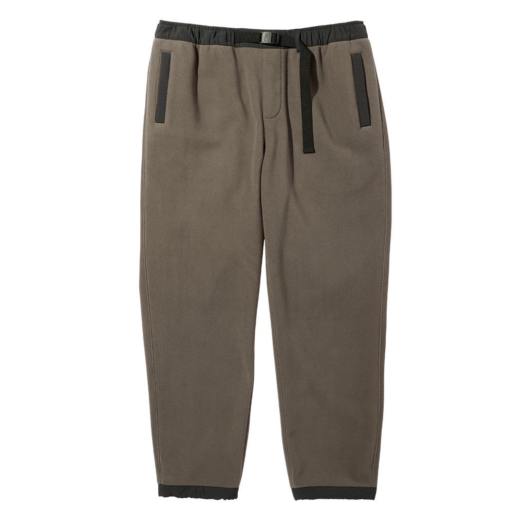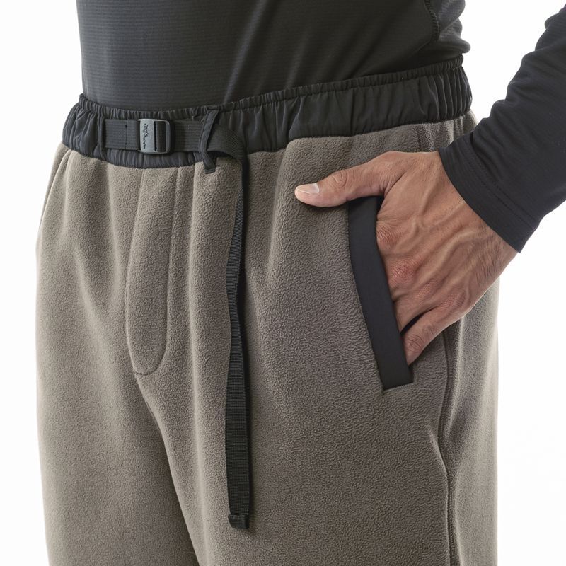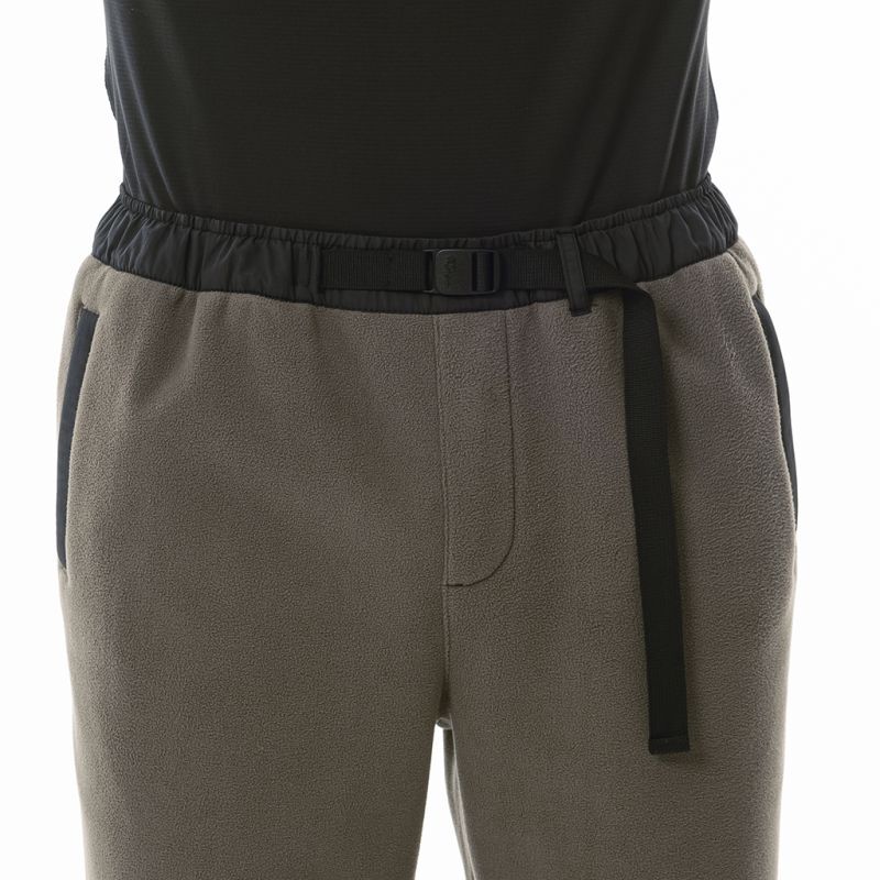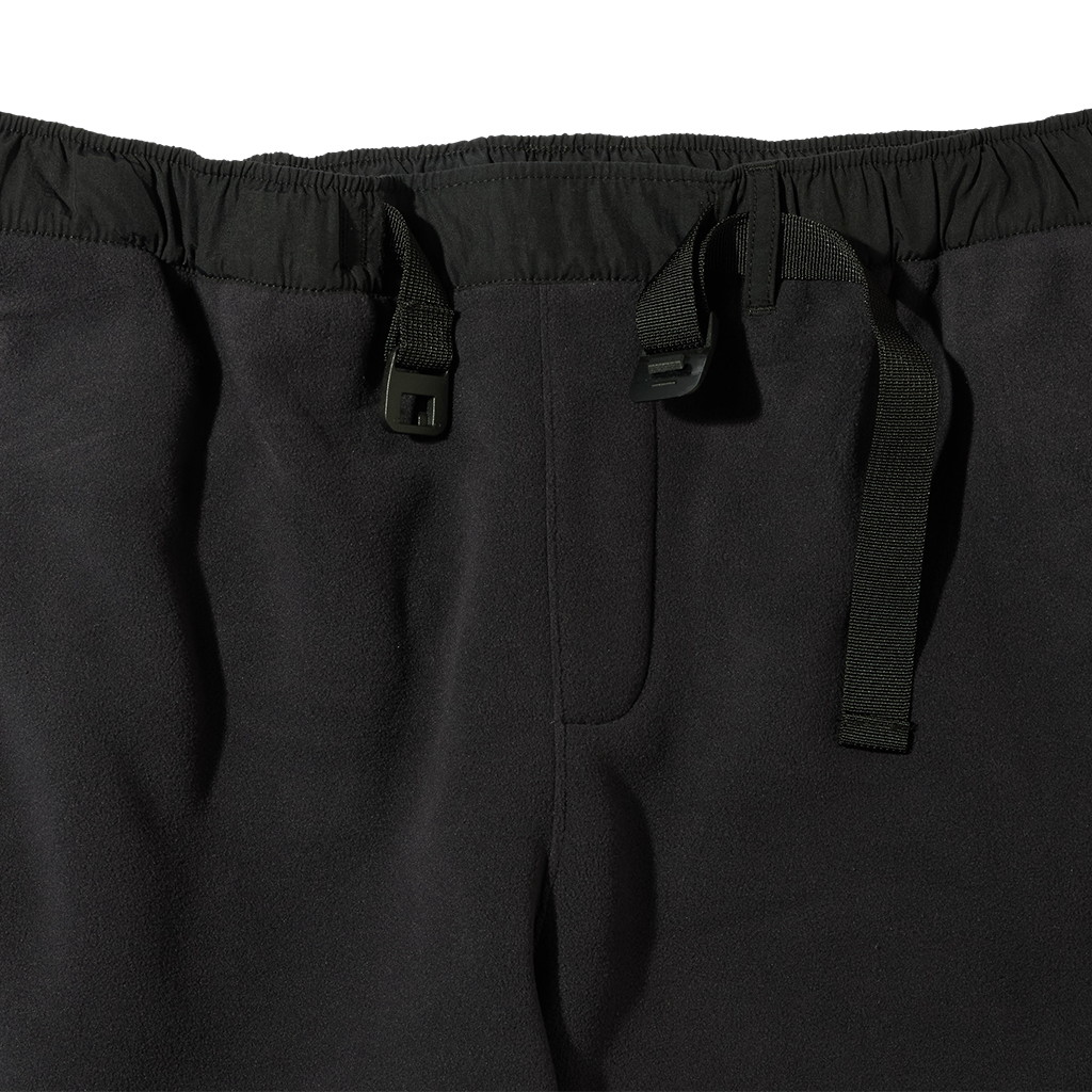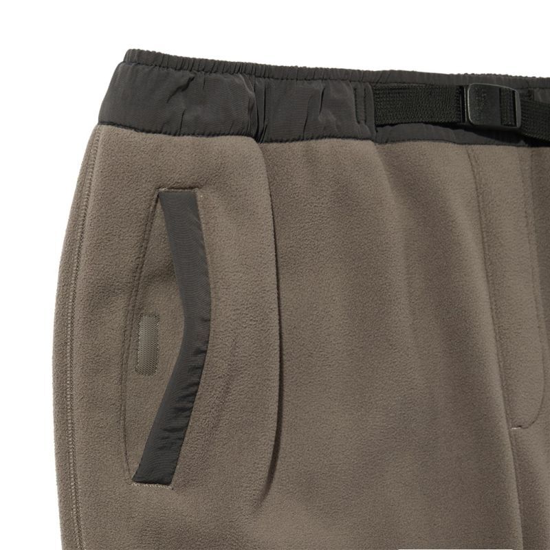 どうしてもルームウエアルックになってしまうフリースパンツですが、要所にナイロンを当てたり、