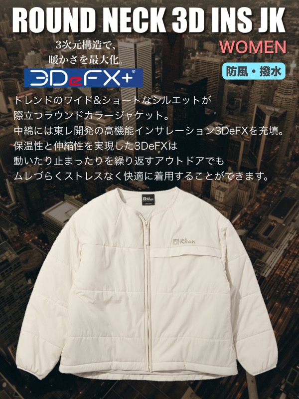 ■【3DeFX+】ストレッチ性をキープしながら軽量かつボリューム感があり、圧縮回復弾性も実現。保温性に優れた三次元ストレッチ中綿とストレッチ生地を融合した素材