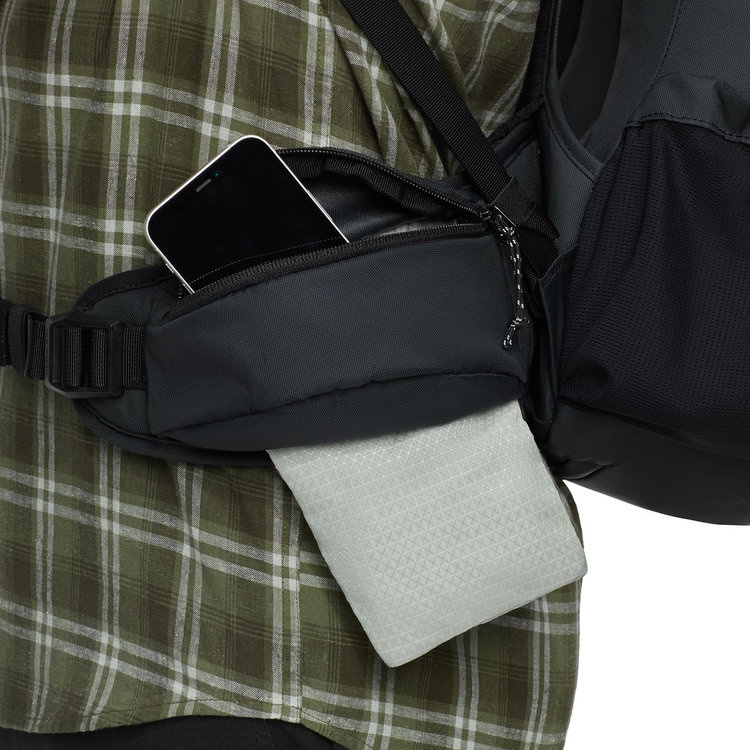 ■ヒップベルトに小物入れとスマホ収納の2気室に分かれたジッパー付きポケット