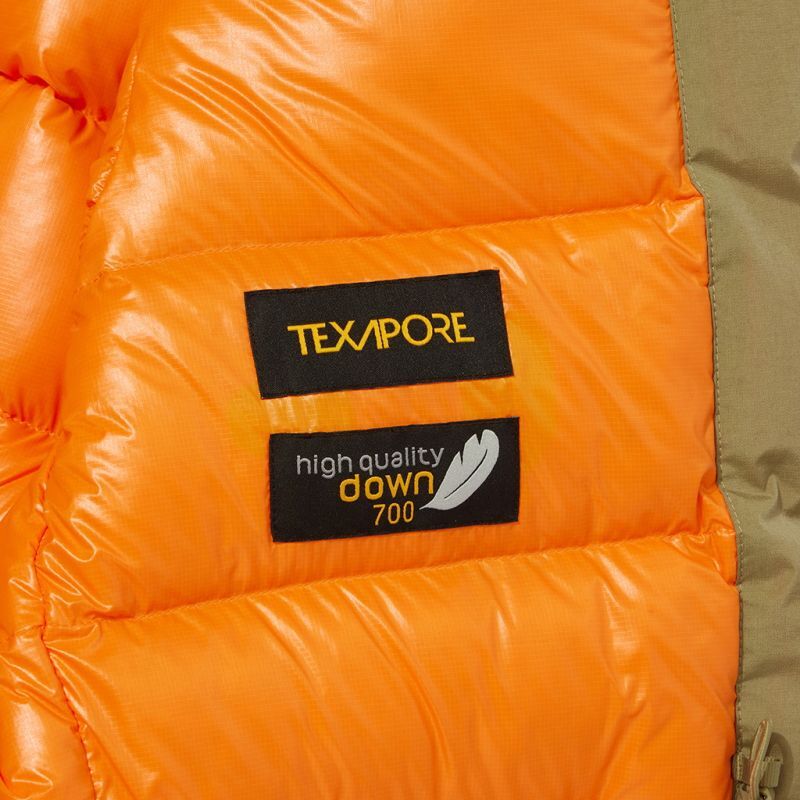 表裏ともにリサイクル生地を使用した、オリジナルの防水透湿システムテキサポールエコスフィアを備えるダウンジャケット。