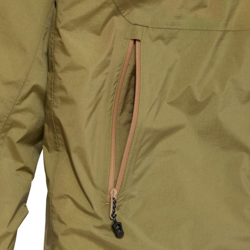 ハンドウォーマーポケットとチェストポケットは止水ジップ、フロントフラップはダブル仕様で、風雨の侵入をシャットアウト。