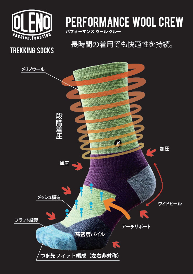 ■快適機能:高品質メリノウール使用、甲部のメッシュ構造、つま先左右非対称設計