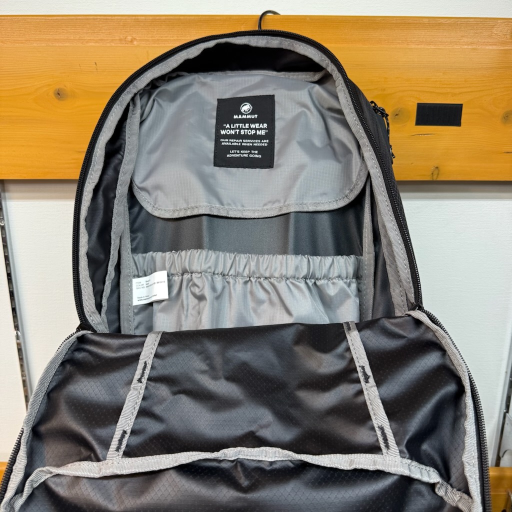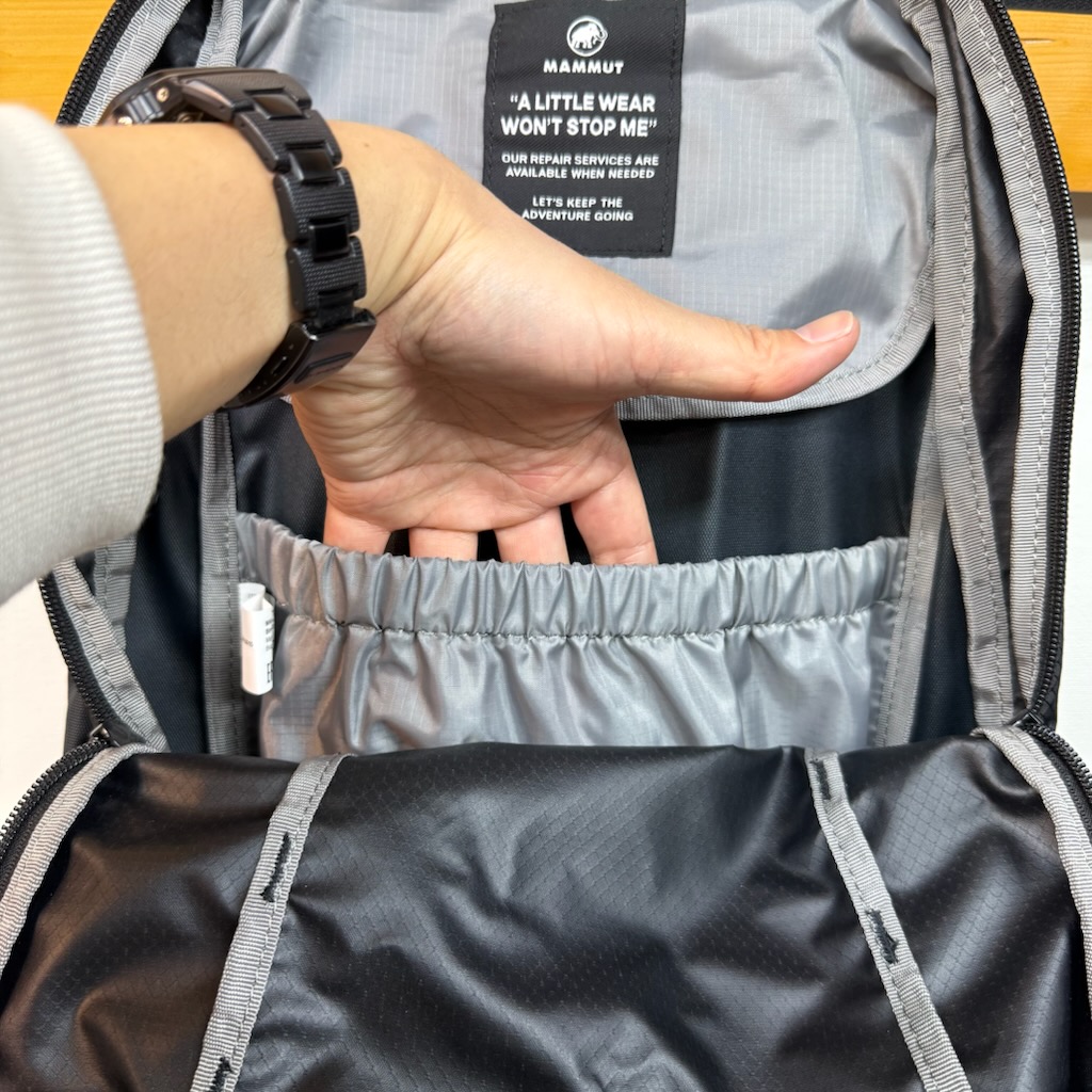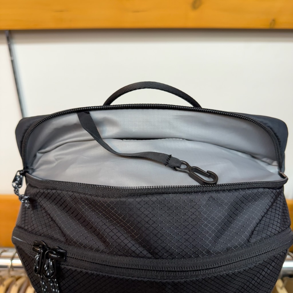 ■ザック上部に手のひらサイズのファスナーポケット、内部にキーリングあり