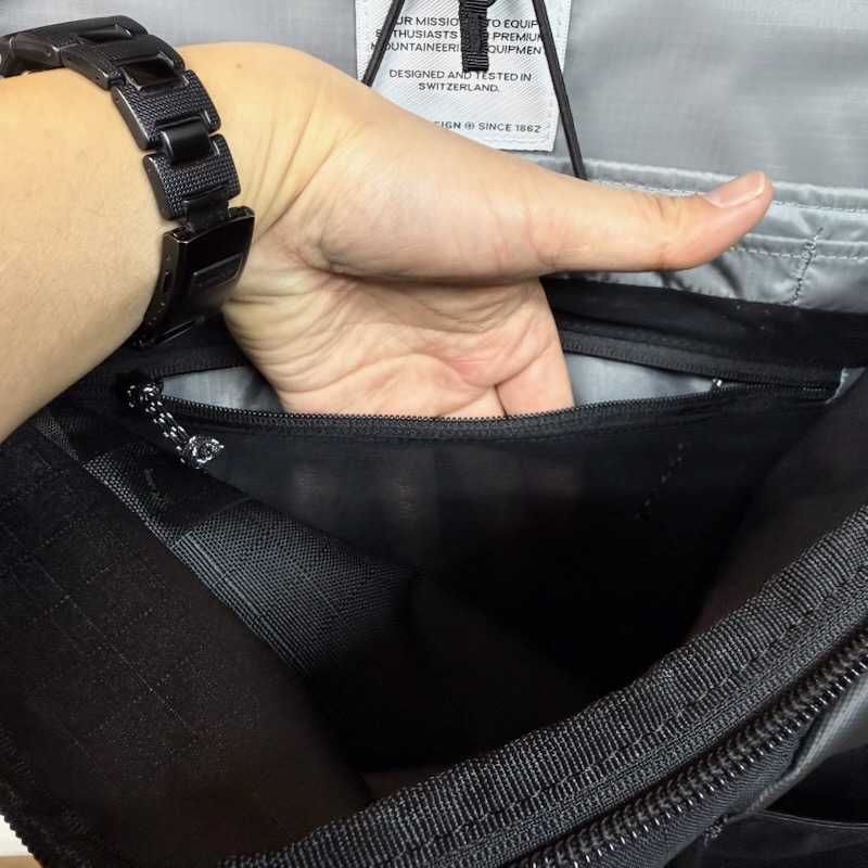 メッシュ素材のワイドなフロントポケット、両サイドのウォーターボトルホルダー、本体内側の仕切りポケットなど、収納力も抜群。